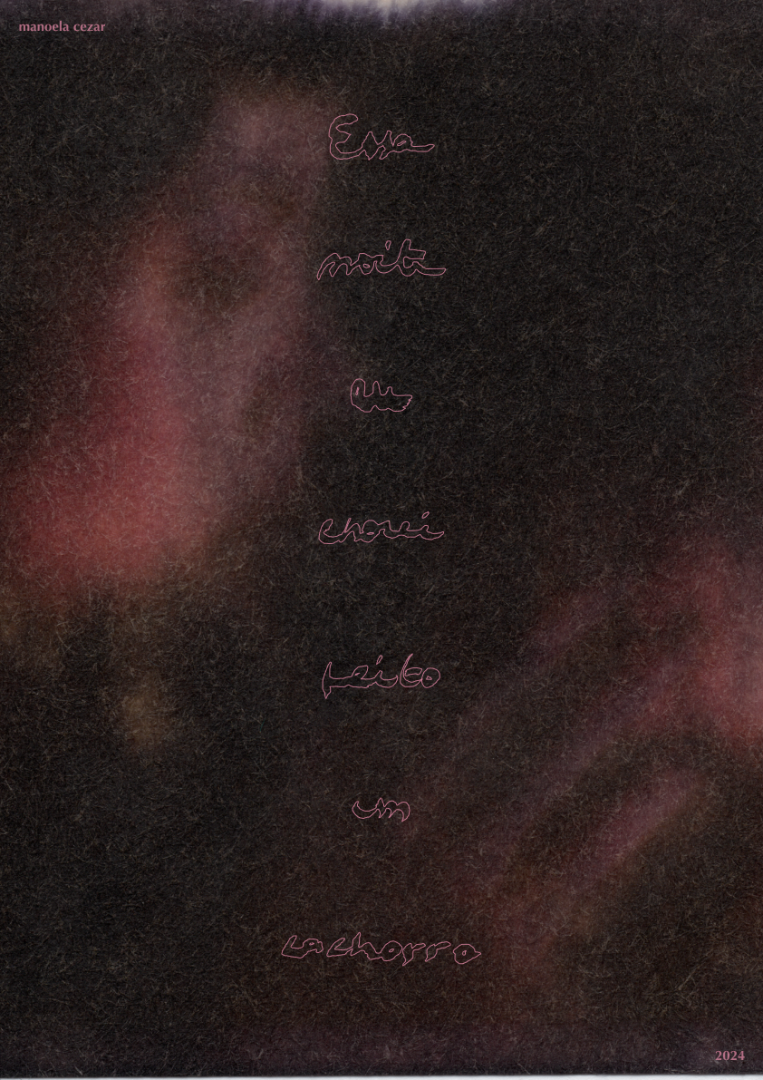 'Essa noite eu chorei feito um cachorro' é um filme experimental criado com técnicas de stop-motion aplicadas a imagens do arquivo pessoal do artista, entrelaçadas com stills de filmes e imagens da internet. Cada quadro foi impresso em papel jornal e embebido em água, produzindo texturas únicas que, uma vez digitalizadas e editadas, animam o filme. A água, evocada pelas lágrimas do título, torna-se tanto tema quanto meio, veículo da ilusão de movimento.