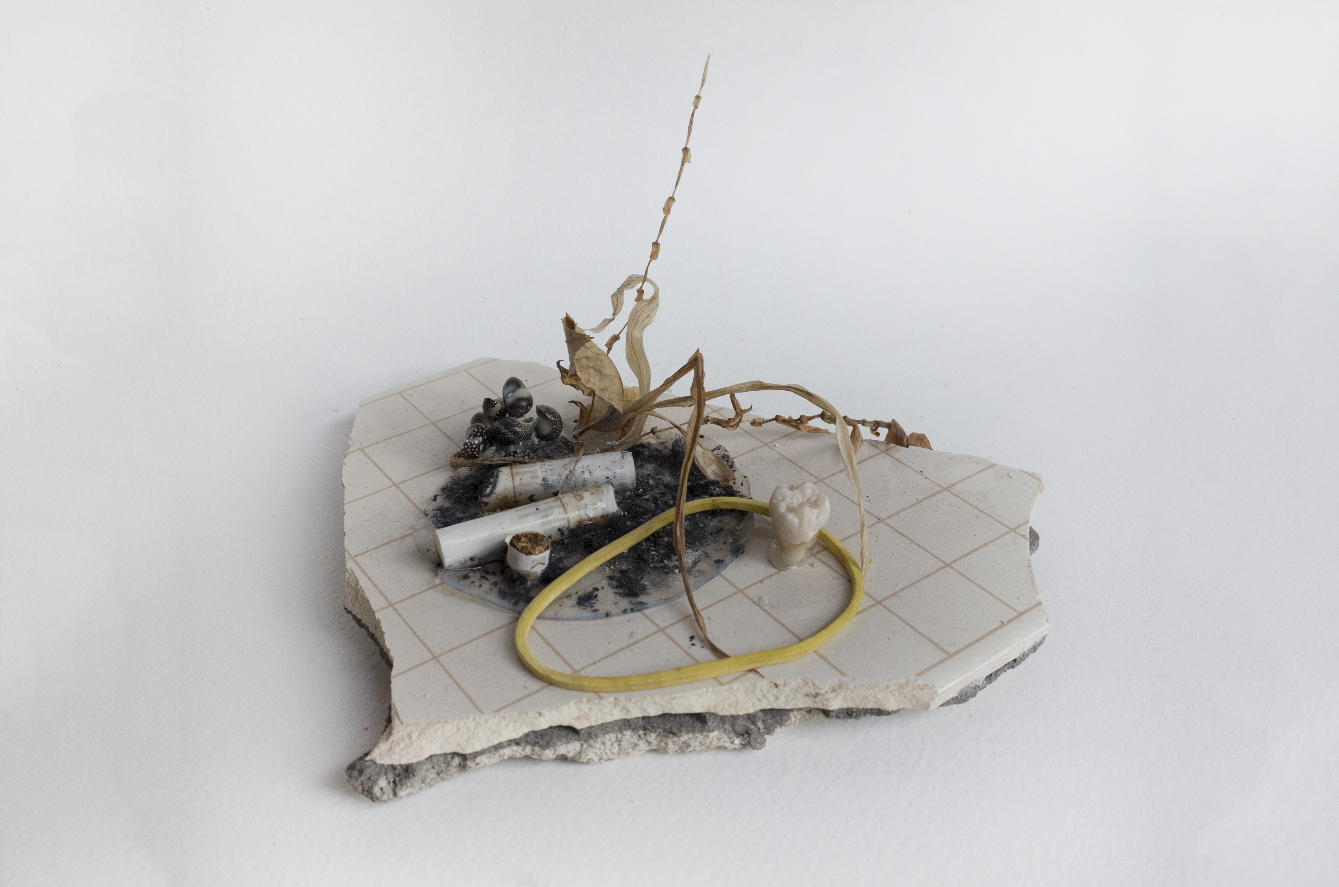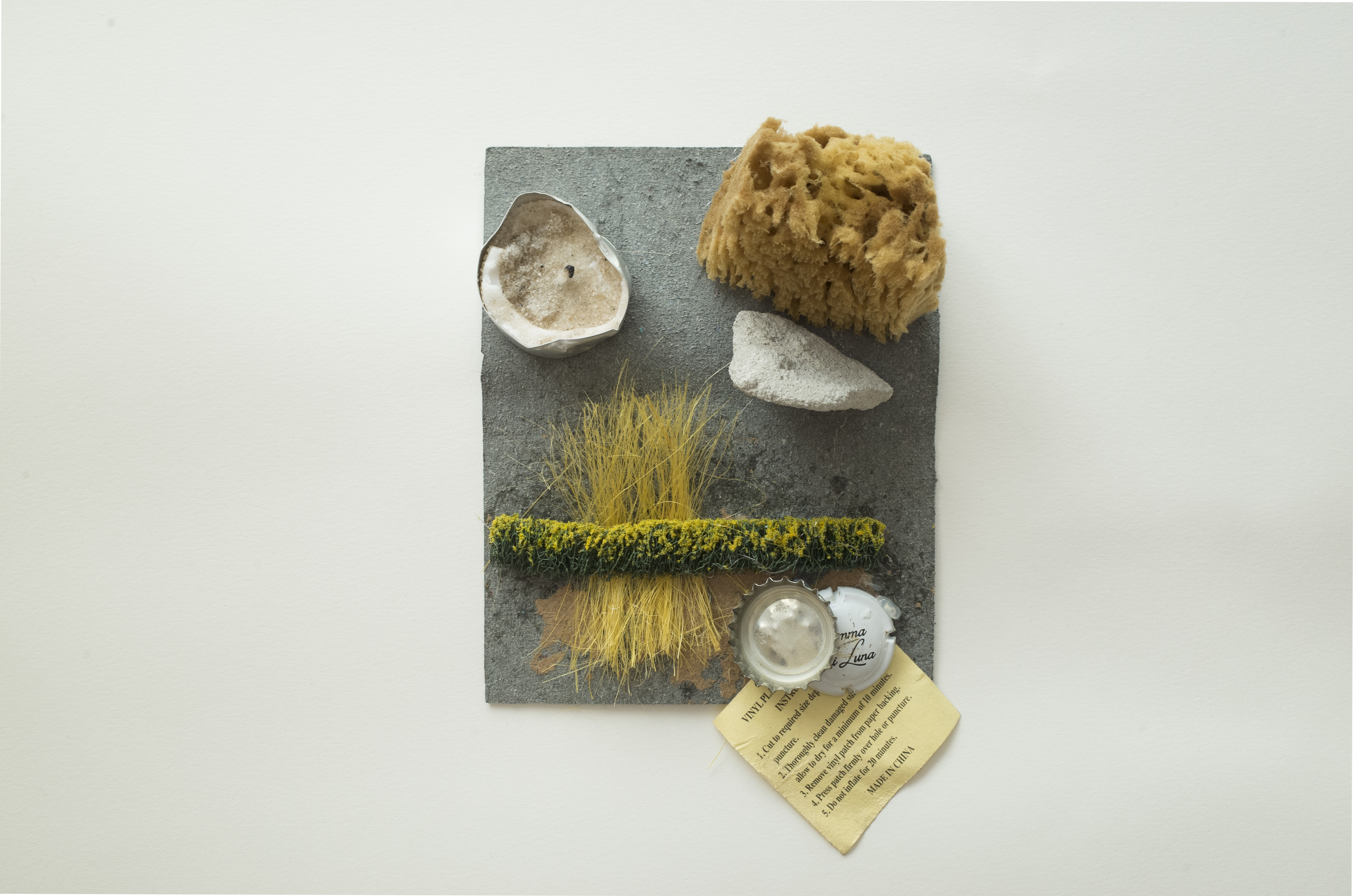 Monumentinhos is a series of 30 ephemeral sculptures assembled from materials collected on the streets of the artist’s neighborhood in São Paulo, combined with personal belongings, dried plants, items found in her collective studio, and objects gifted by friends. Each Monumentinho forms either a small landscape, its own environment, or a tribute to the person who offered one of the objects included in it. The title, which translates to “little monuments,” contrasts with the grand scale of traditional city monuments, using debris and discarded materials to honor the passage of time and the fagility of life.