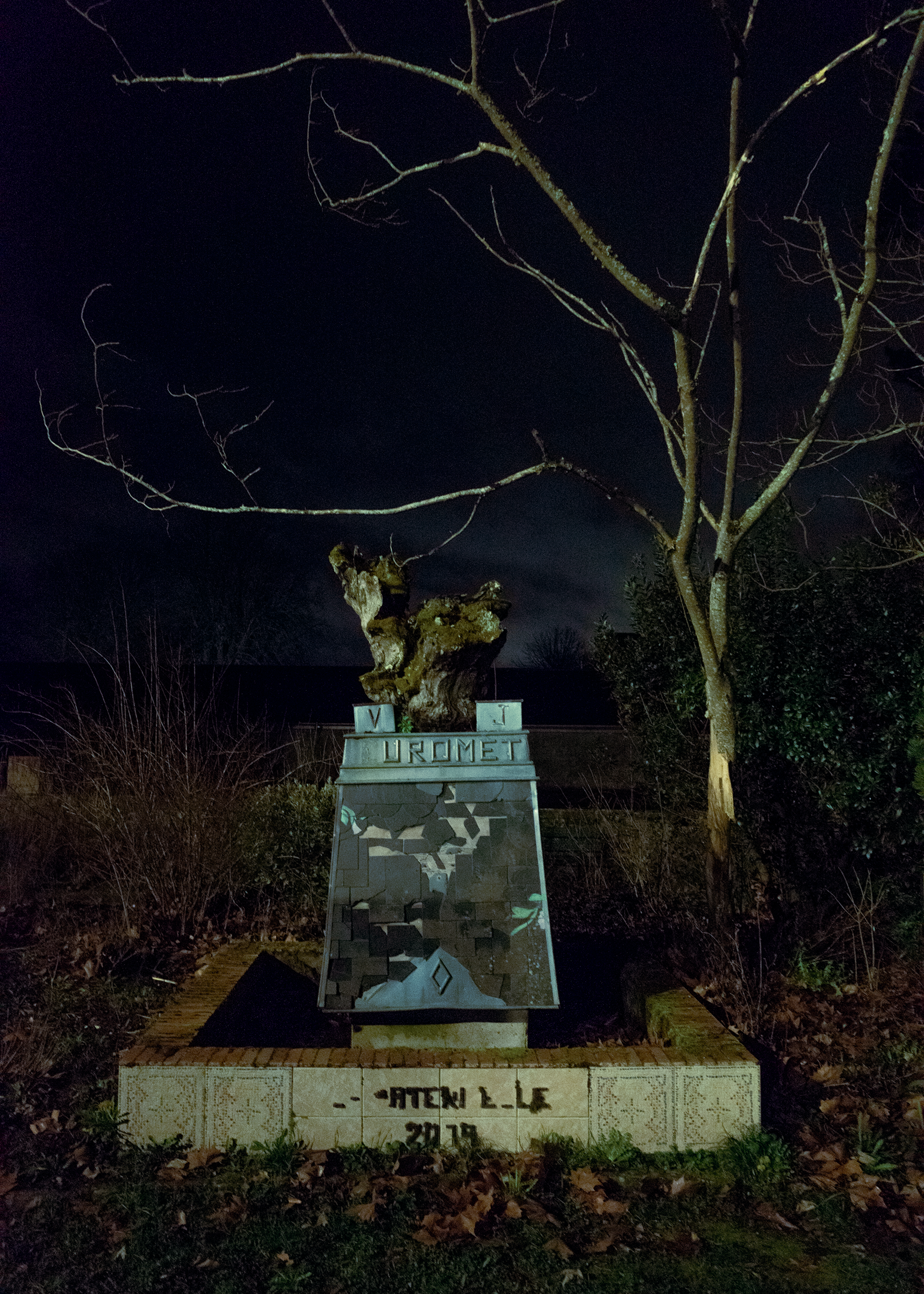 No dia em que filmei Driving…, encontrei este totem no antigo terreno da Colônia Penal de Mettray. O lugar não possui placas, memoriais ou qualquer marca que remeta à história da instituição; o único monumento existente é esse, que nada diz sobre o passado carcerário do sítio. Sua presença opera como um monumento acidental: um gesto celebrativo que, ao invés de lembrar, afirma o esquecimento. O totem torna visível a negação da memória, substituindo a história da colônia por uma forma vazia de significado histórico.
